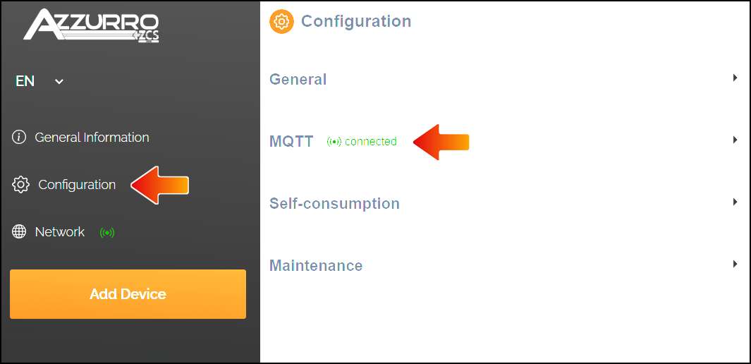 Um die Logindaten der Combox zu ändern, loggen Sie sich in das Gerät ein und klicken auf "Configuration" und anschließend auf "MQTT".