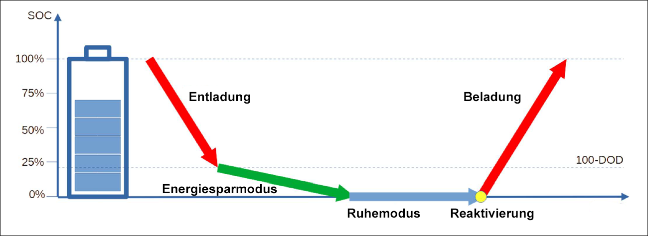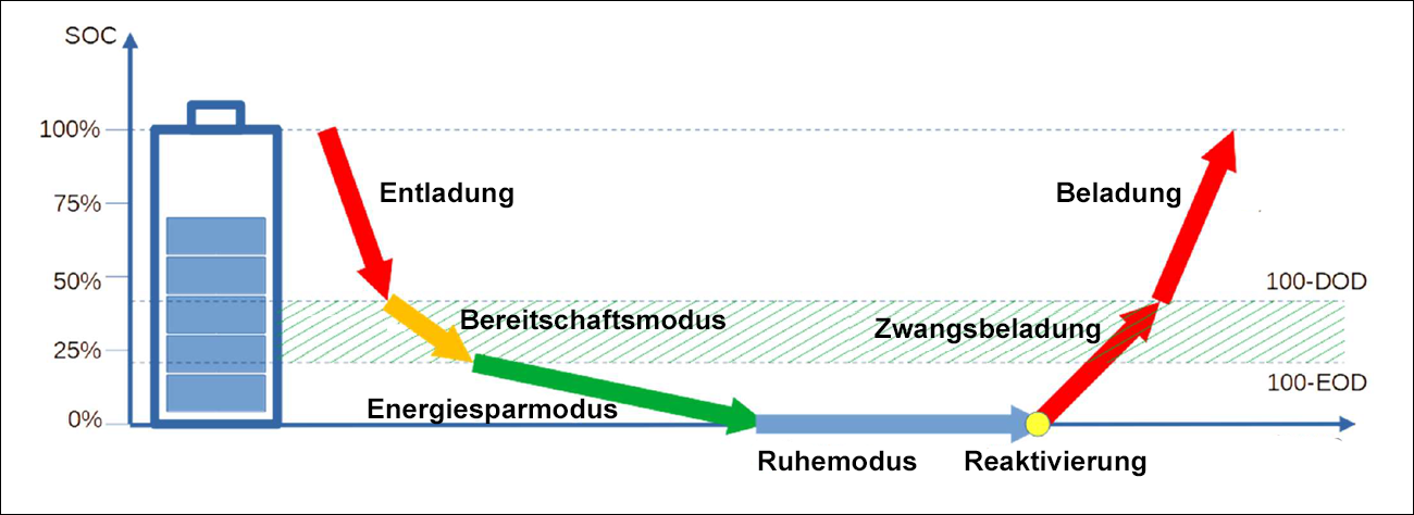 Wenn der DoD erreicht wird, versetzen sich die Module in den Bereitschaftsbetrieb und verweilen so, bis der eingestellte EoD erreicht wird. Bei einem plötzlich auftretenden Netzausfall kann der Speicher in diesem Pufferraum unverzögert die Energie für den Verbrauch der kritischen Lasten bereitstellen. Wird der EoD erreicht, werden die Batteriemodule in den Energiesparmodus versetzt und begeben sich bei fehlender Beladung in den Ruhemodus.
