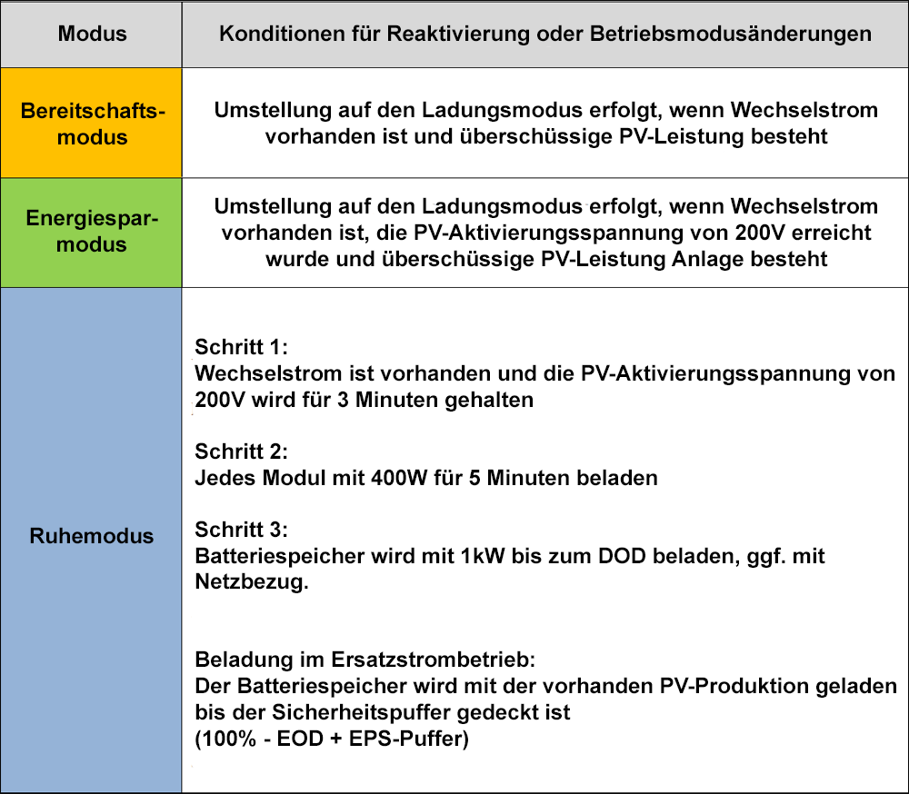 Bei der Reaktivierung erfolgt eine Zwangsbeladung mit max. 1kW pro Modul bis der DoD erreicht wird. Die benötigte Energie kann unter Umständen vom Netz bezogen werden.