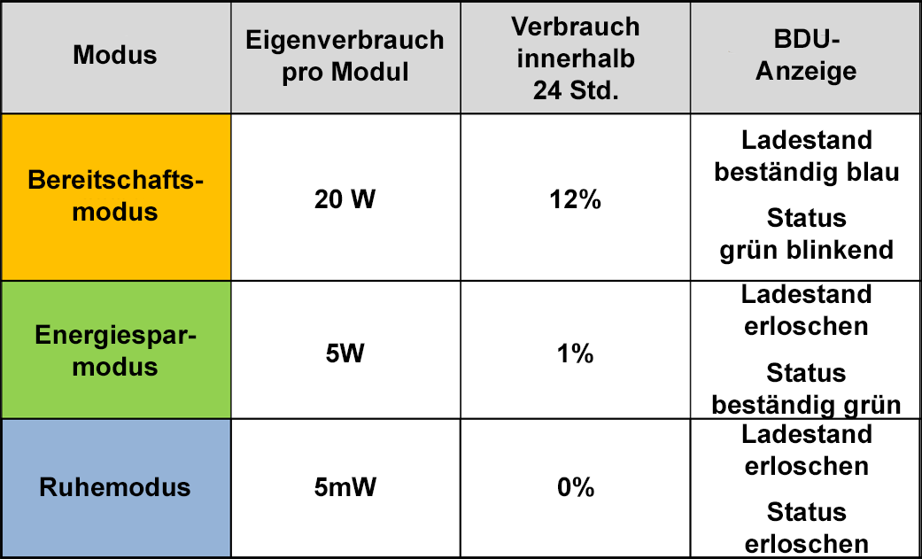 - Der Bereitschaftsmodus gleicht funktionell dem Ladungsmodus wobei aktuell kein Strom fließt. Das Modul ist bereit Strom aufzunehmen oder bei Bedarf zu speisen. Der Eigenverbrauch pro Modul sind 20W. Es ist mit einem Ladestandsabfall von 12% innerhalb 24 Stunden zu rechnen. Die Ladestandsanzeige leuchtet beständig blau und die Statusanzeige blinkt grün.