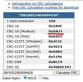 - CRC-16 Prüfsumme ist der benötigte Code (Bsp. DA21)