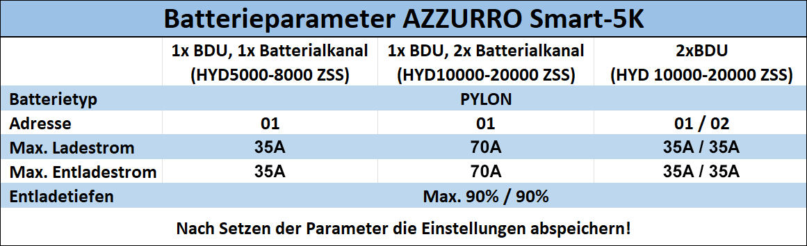 Der AZZURRO Smart-5K Batteriespeicher erlaubt dem Hybridwechselrichter die automatische Zuweisung der Batterieparameter wenn eine andere Spannungsquelle wie PV oder Netz bereits aktiv ist. Wenn der Hybridwechselrichter bei Erstinbetriebnahme per Schwarzstart durch den Batteriespeicher gestartet wird, ist eventuell eine manuelle Parametrierung notwendig. Navigieren Sie zu Erweiterte Einstellungen > Batterie-Einstellungen und stellen Sie im Submenü Batterie 1 (und ggf. Batterie 2) die Parameter ein.