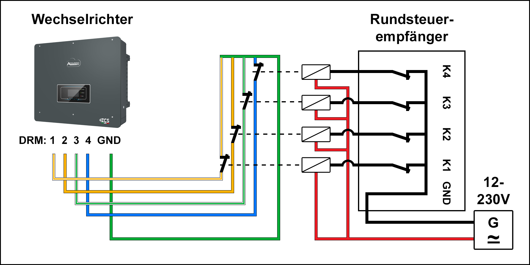 Zur Drahtbruchsicherung erfordern einige Netzbetreiber die Nutzung von Rundsteuerempfängern mit Öffnerkontakten. Der direkte Anschluss der von den Wechselrichtern ausgehenden Steuerstromkreise führt zur Fehltriggerung. Um dies zu vermeiden wird die Nutzung zusätzlicher Koppelrelais vorausgesetzt.