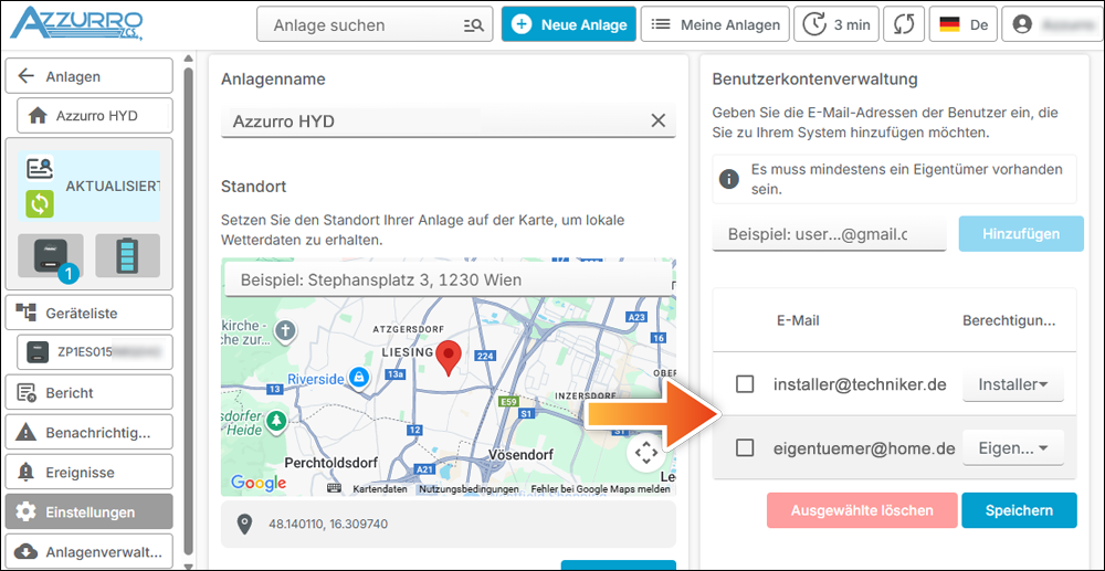 Im letzten Schritt vor der Beendigung tragen Sie den Account des Anlagenbesitzers als "Eigentümer" ein und ändern Sie Ihre Berechtigung als "Installateur".
