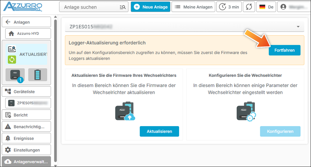 Begeben Sie sich nachfolgend zur Anlagenverwaltung und tippen Sie auf die Schaltfläche "Fortfahren".