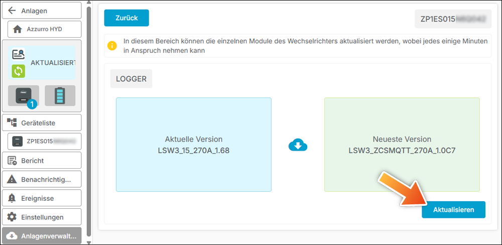 Mit dem derzeit erhältlichen Firmware-Update V120005 wird die Konnektivität zwischen Hybridwechselrichter und Logger erweitert. Um die Monitoringdaten des Hybridwechselrichters zu erhalten, muss der Logger ebenfalls aktualisiert werden. Stand 08.10.2025 wird in den nächsten Tagen ein weiteres Update für die AZZURRO Operators App erwartet, welches das passende Loggerupdate für die WiFi- und Ethernet-Varianten anbietet.