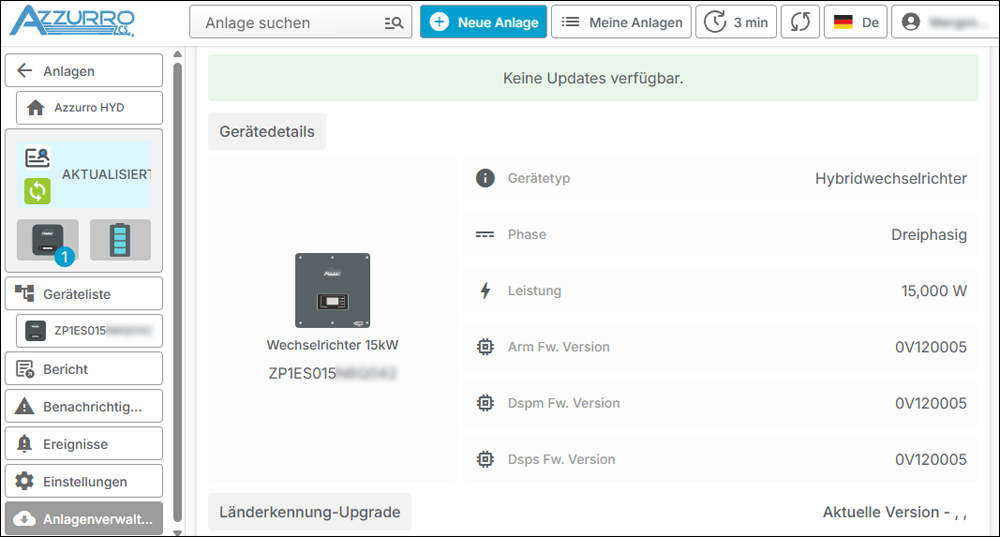 Nach Abschluss des Updates werden Sie zur folgenden Seite geführt. Dort können Sie bei Bedarf die Firmware-Stände des Hybridwechselrichters kontrollieren und die Länderkennung anpassen, sofern dies noch nicht über die AZZURRO Operators App erfolgte. Sie sollten in Kürze aktuelle Telemetriedaten vom Gerät erhalten.