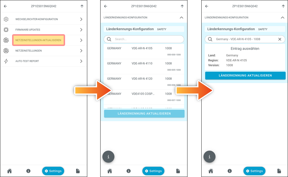 Tippen Sie auf "Netzwerkeinstellungen Aktualisieren". Die App ruft eine Liste an verfügbaren Länderkennungen ab. Nutzen Sie die Eingabezeile um die benötigte Länderkennung für Ihr Gerät zu filtern (Englischer Landesname, Normbezeichnung...). Bestätigen Sie die Auswahl durch Tippen auf "XXX" um die Länderkennung zu installieren.