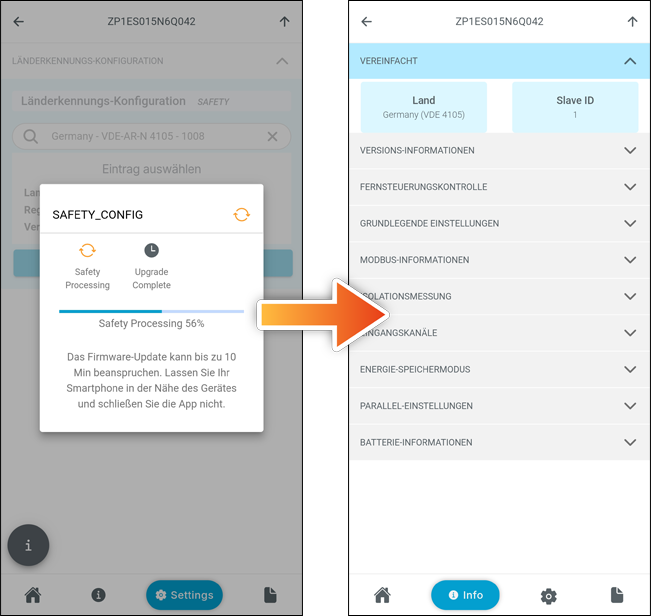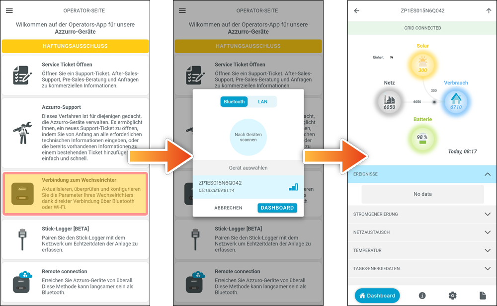 Öffnen Sie die AZZURRO Operators App und tippen Sie auf die Schaltfläche "Verbindung zum Wechselrichter". Im nachfolgenden Pop-Up Fenster tippen Sie auf den Button "Nach Geräten scannen". Wählen Sie die Seriennummer des Wechselrichters aus mit dem Sie sich koppeln möchten und tippen Sie auf die Schaltfläche "Dashboard". Sie gelangen zur Energieübersicht des Gerätes. Tippen Sie anschließend auf das Zahnrad-Symbol in der unteren Leiste um in die Geräte-Einstellungen zu gelangen.