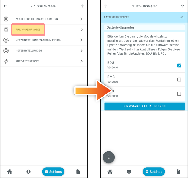 Tippen Sie auf die Rubrik "Firmware-Aktualisierung". Wenn Sie die aktuellste Firmware-Version des Hybridwechselrichters bereits installiert haben, wird nur die Rubrik "Batterie-Upgrades" angezeigt. Die Module müssen jeweils einzeln ausgewählt und installiert werden. Markieren Sie das benötigte Modul und tippen Sie auf die Schaltfläche "Firmware Aktualisieren". Halten Sie sich immer an die dargestellte Reihenfolge: