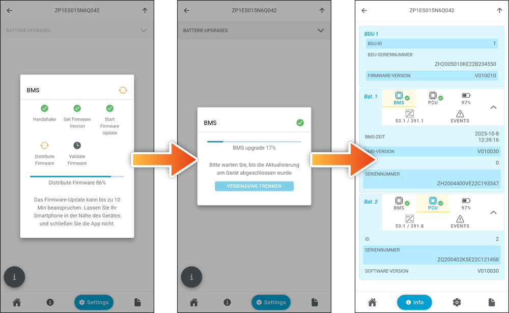 Sie können den Aktualisierungsprozess der Firmware-Module simultan am Display des Wechselrichters oder der Operators App mitverfolgen. Sie müssen die App während dieser Phase nicht aktiv halten. Nach Abschluss des Firmware-Updates muss die Kopplung zum Hybridwechselrichter wiederhergestellt werden.