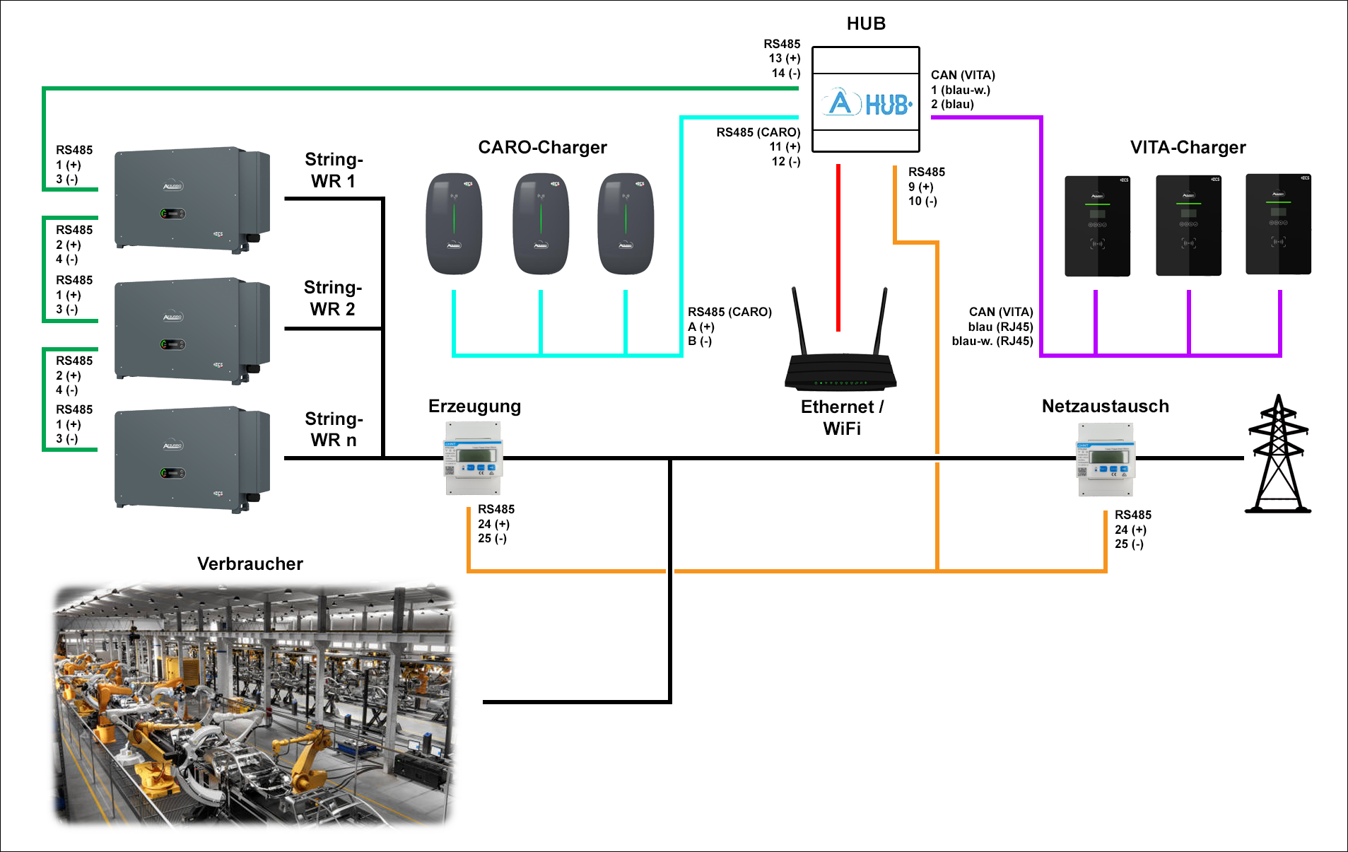 Es können max. 32 CARO-Charger an den vom HUB bereitgestellten RS485-Bus angeschlossen werden. Eine eindeutige Adressierung jedes Chargers ist Voraussetzung für eine funktionierende Kommunikation. Die physikalischen Anschlüsse der einzelnen Geräte unterliegen hierbei keiner strikten Reihenfolge. In der folgenden Anleitung wird die Konfiguration der CARO-Charger thematisiert - Anbindung der CARO-Charger