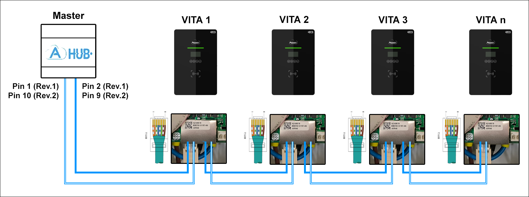 Schließen Sie nach Installation der AZZURRO VITA diese an die Stromversorgung an um zu prüfen ob sich die Geräte einschalten lassen. Beim fehlerfreien Zustand leuchtet der LED-Streifen auf der Frontplatte über dem Display grün. Schalten Sie die Stromversorgung wieder ab und öffnen Sie den Charger. Führen Sie das/die Kommunikationskabel durch den mittigen Kabelzugschutz unterhalb des Gerätegehäuses. Schließen Sie das Netzwerkkabel anschließend in einen der RJ45-Ports auf der Platine. Wenn Sie mehrere VITA per Daisy-Chain mit dem AZZURRO HUB verbinden möchten. wird das zweite Netzwerkkabel an dem noch freien RJ45-Port angeschlossen und zur nächsten VITA weitergeführt. Es können max. acht VITA-Charger am Bus angeschlossen werden.
