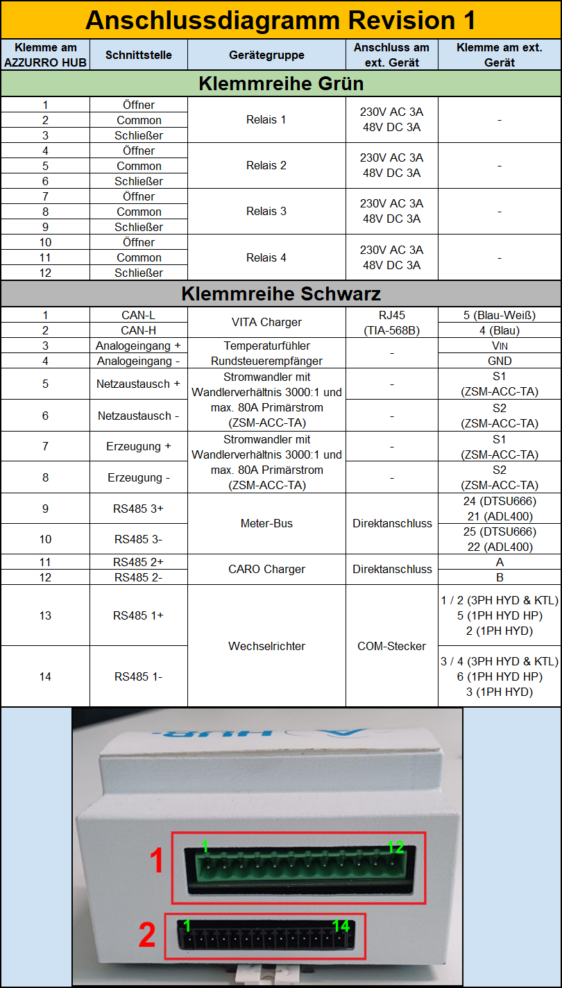 Das AZZURRO HUB ist sechs Teileinheiten breit und wird auf eine DIN-Hutschiene 35mm angebracht. Die Stromversorgung erfolgt direkt über 230V Netzspannung, das Gerät soll mit einem Leitungsschutzschalter Typ B 6A abgesichert werden. Auf der oberen Gehäuseseite befinden sich folgende Anschlüsse: