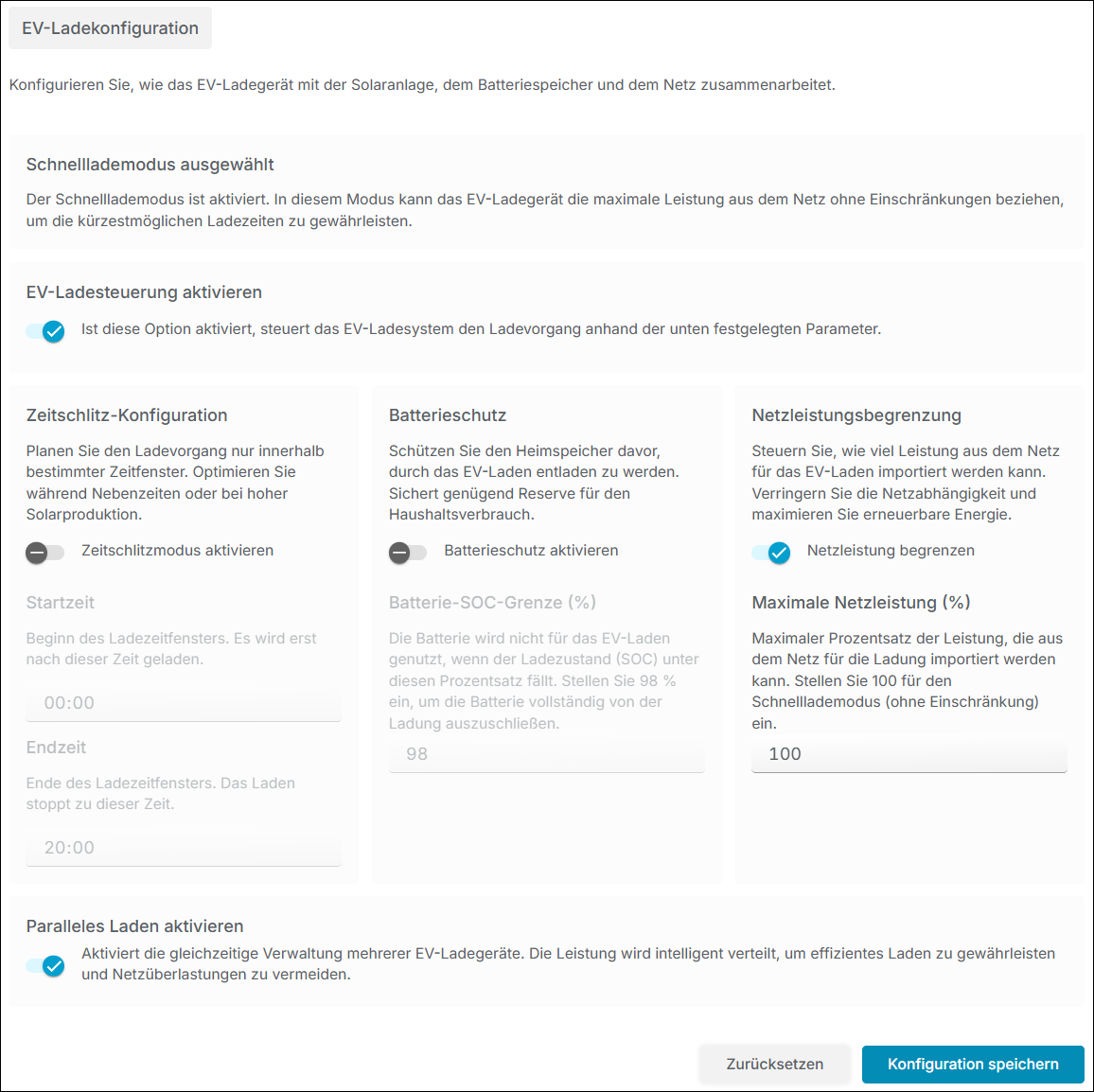 Der Schnelllademodus wird ausgewählt, indem die Funktion Netzbezugsleistung mit 100% aktiviert wird. Ein niedrigerer Wert ändert die Steuerung der Ladestationen auf den Green-Modus.