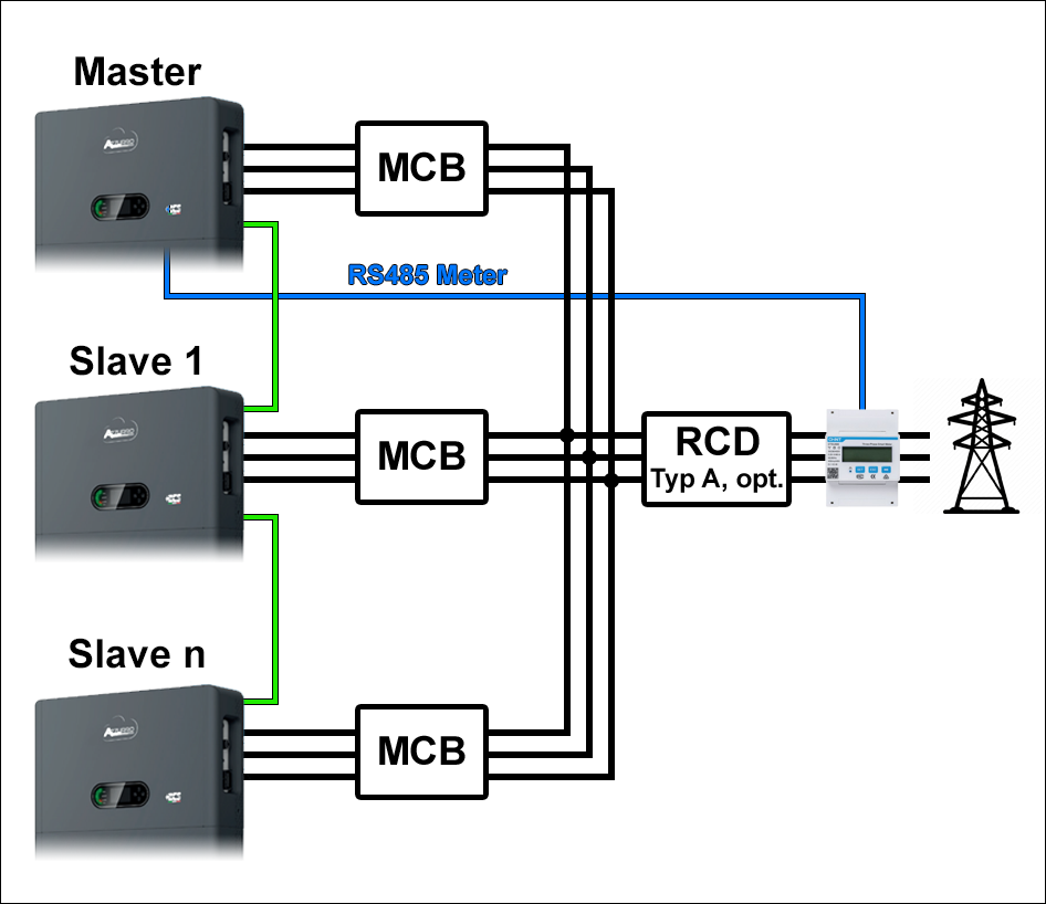 In der folgenden Abbildung wird eine Kaskade im reinen Netzparallelbetrieb dargestellt. Die Netzseite wird mit einer Überstromsicherung (MCB) pro Zuleitung zu den Geräten und einem globalen Fehlerstromschutzschalter Typ A mit 300mA abgesichert.