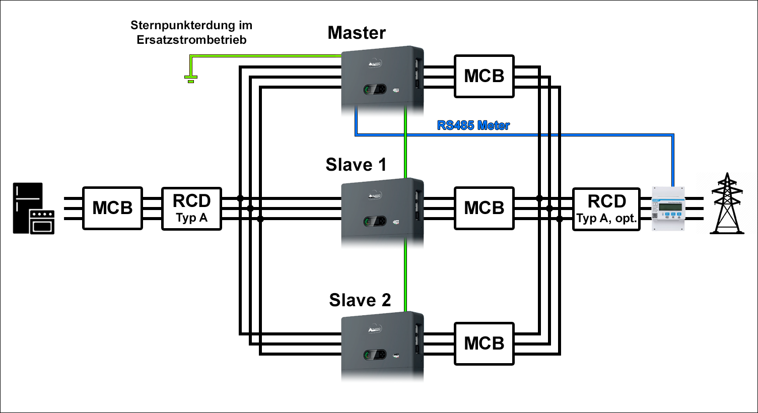 In der folgenden Abbildung wird eine Kaskade mit Ersatzstromfunktion dargestellt. Die Netzseite wird mit einer Überstromsicherung (MCB) pro Zuleitung zu den Geräten und einem globalen Fehlerstromschutzschalter Typ A mit 300mA abgesichert. Die Ersatzstromseite wird nach dem Verknotungspunkt mit einer Überstromsicherung und Fehlerstromschutzschalter(n) Typ A abgesichert. Die Sternpunkterdung der Insel erfolgt über die Master-Einheit.