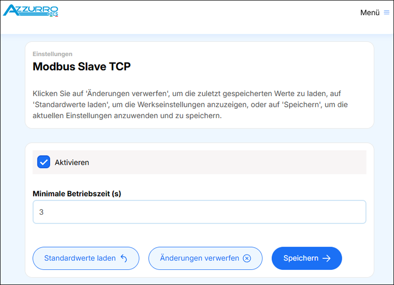 Navigieren Sie im Lokalserver des HUBs auf Einstellungen > Modbus Slave TCP. Setzen Sie das Häkchen um die Funktion zu aktivieren und geben Sie in der unteren Zeile die gewünschte Verzögerungszeit (Delay) ein. Die kürzeste einstellbare Dauer beträgt 3 Sekunden. Beim Clienten sind die Dauer für Delay und Timeout mit denselben Werten einzustellen.
