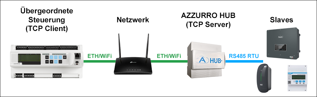 Das AZZURRO HUB erlaubt als TCP-Server die Kommunikation mit übergeordneten Steuergeräten (z.B. Parkregler) in der Rolle als TCP Client. Durch das HUB erhält der verbundene Client sowohl Lese- als auch Schreibzugriff auf jene AZZURRO-Geräte, welche über ModbusRTU mit dem HUB kommunizieren.