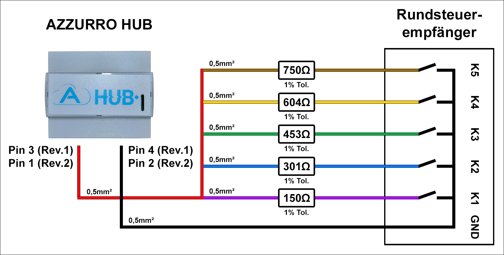 Die vom HUB ausgehende Signalleitung wird in 5x parallele Linien mit je einem in Reihe angeschlossenen Widerstand gesplittet. Diese Signalleitungen werden anschließend zum Rundsteuerempfänger geführt. Die vom Rundsteuerempfänger ausgehende Masseleitung wird am HUB angeschlossen.
