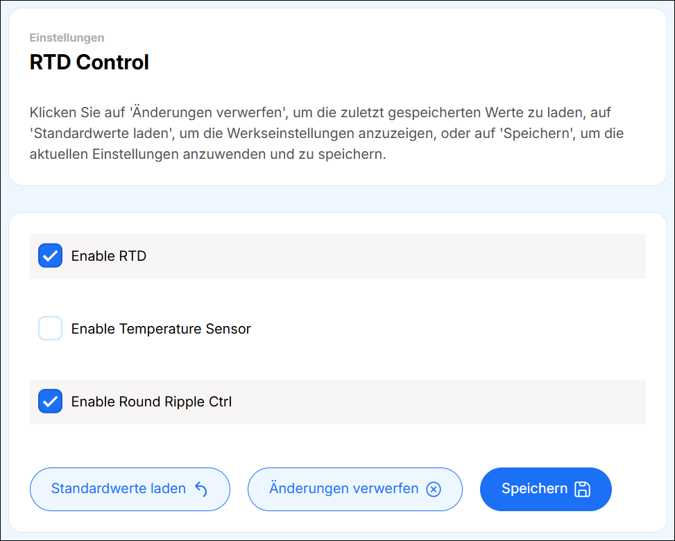Navigieren Sie zu Einstellungen > RTD Control. Setzen Sie die Häkchen neben "Enable RTD" und "Enable Round Ripple Control" und speichern Sie diese Einstellungen. Unter Überwachung > RTD kann nachverfolgt werden, ob die Verschaltung korrekt ausgeführt wurde und die Schaltzustände ausgelöst werden.