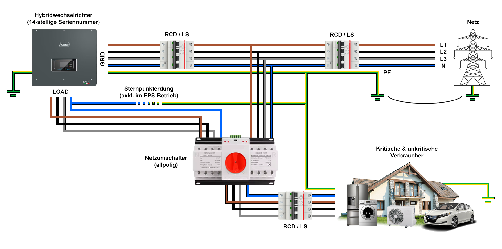 In der folgenden Abbildung wird eine Anlage mit einer optionaler allpoligen Netzumschaltung dargestellt. Bei einer Netzstörung oder einem Netzausfall trennt sich der Hybridwechselrichter allpolig vom Netz und die hergestellte Insel verliert das vom Ortstransformator gestellte Erdpotential. Der Sternpunkt der Erzeugungseinheit ist im Inselbetrieb von Erde isoliert (IT-Netzform). Fehlerschutzschalter würden bei auftretenden Körperschlüssen an kritischen Verbrauchern oder erhöhten Ableitströmen gegen Erde nicht reagieren. Mithilfe der Sternpunkterdung, welche exklusiv im Ersatzstrombetrieb durch die Schützschaltung bereitgestellt wird, entsteht ein TN-S Netz mit definierten Erdpotential.