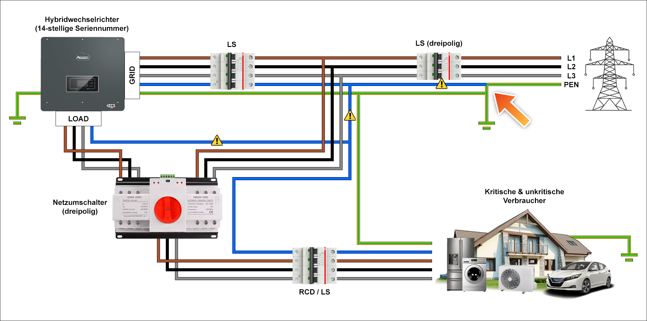In der folgenden Abbildung wird eine Anlage mit einer optionaler dreipoligen Netzumschaltung dargestellt. Bei einer Netzstörung oder einem Netzausfall trennen die internen Koppelrelais des Hybridwechselrichters diesen allpolig vom Netz. Durch die unterbrechungsfreie Verbindung zwischen dem Neutralleiter-Anschluss des LOAD-Ausgangs und dem PEN-Trennpunkt am HAK der Anlage reagieren Fehlerschutzeinrichtungen weiterhin auf auftretende Körperschlüsse an kritischen Verbrauchern und überhöhten Ableitströmen. Dies erspart die Installation einer Relaisschaltung zur Sternpunkterdung der Insel. Bedenken Sie, dass im Ersatzstrombetrieb die Kabelstrecke zwischen PEN-Trennpunkt und Neutralleiter-Anschluss am LOAD-Ausgang effektiv als PEN-Leiter gilt. ZCS AZZURRO empfiehlt die Anwendung einer allpoligen Trennung zwischen Netz- und Inselseite.