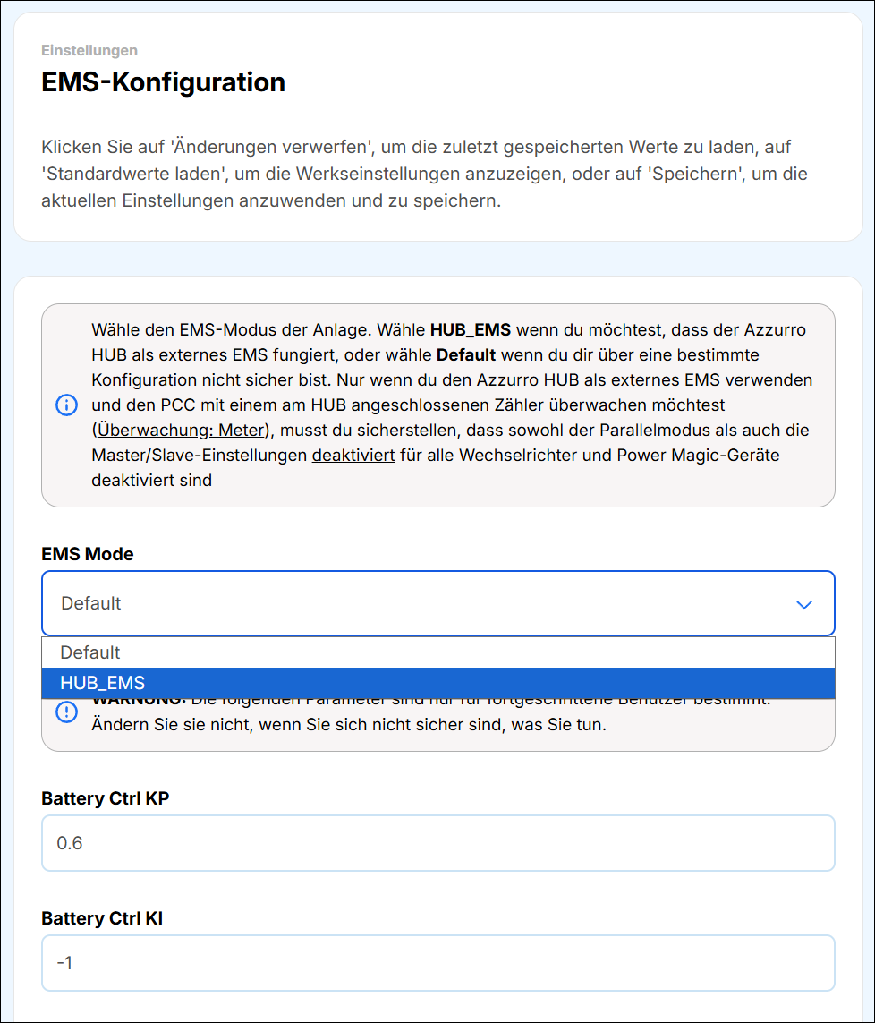 Navigieren Sie danch zum Menüpunkt Einstellungen > EMS-Konfiguration und wählen Sie die Option "EMS-HUB" aus. Diese Option übeträgt das Energiemanagement der Anlage an das AZZURRO HUB.