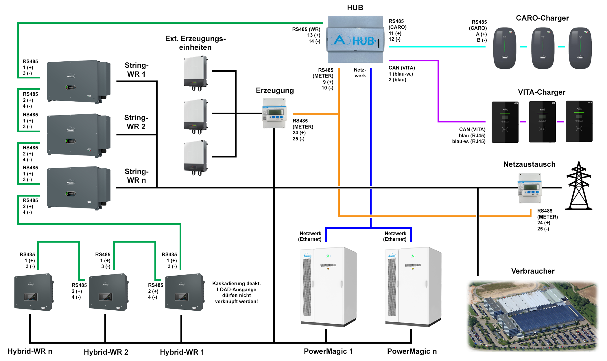 Für die Verwendung des AZZURRO HUB als zentrales EMS ist das unten abgebildete Anlagenschema anzuwenden. Folgende Möglichkeiten stünden somit zur Verfügung: