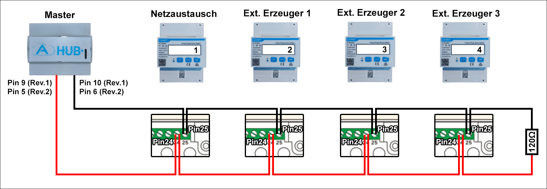 Bis zu vier Meter können per Daisy-Chain zu einem Bus an das AZZURRO HUB angeschlossen werden. Auch hier muss jedem Meter eine eindeutige Modbusadresse zwischen 1-4 zugewiesen werden, wobei die Adresse 1 immer für den Netzaustausch gilt. Auch hier unterliegen die physikalischen Anschlüsse der einzelnen Geräte keiner strikten Reihenfolge. Es empfiehlt sich den Bus am letzten Meter mit einem 120Ohm-Widerstand zu terminieren um Störsignale zu unterbinden.