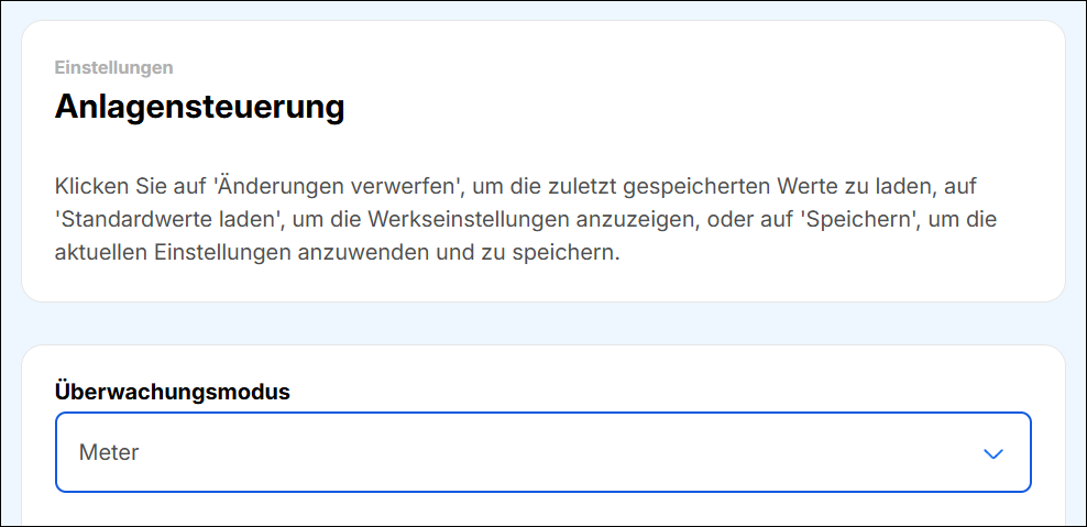 Navigieren Sie im Lokalserver des AZZURRO HUBs zum Menüpunkt Einstellungen > Anlagensteuerung und wählen Sie die Option "Meter" aus. Der Energy-Meter mit der Adresse 1 wird somit als Quelle des Netzaustausches definiert.