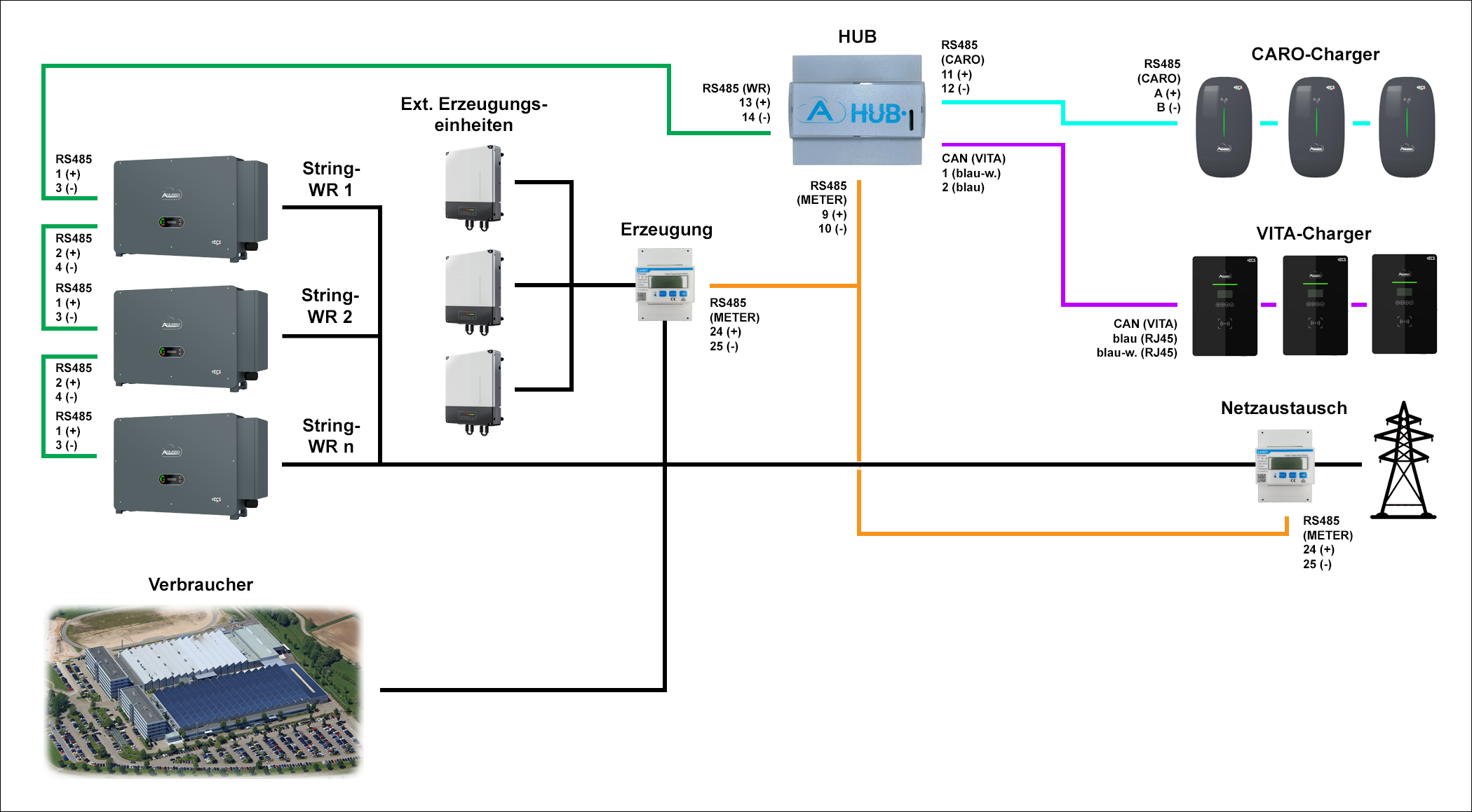 Es können max. 32 CARO-Charger an den vom HUB bereitgestellten RS485-Bus angeschlossen werden. Eine eindeutige Adressierung jedes Chargers ist Voraussetzung für eine funktionierende Kommunikation. Die physikalischen Anschlüsse der einzelnen Geräte unterliegen hierbei keiner strikten Reihenfolge. In der folgenden Anleitung wird die Konfiguration der CARO-Charger thematisiert - Anbindung der CARO-Charger