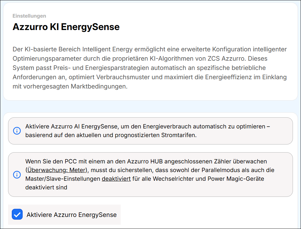Navigieren Sie im Lokalserver zu Einstellungen > Azzurro KI Energy Sense. Die Algorithmus-gestützte Optimierung ist standardgemäß deaktiviert.