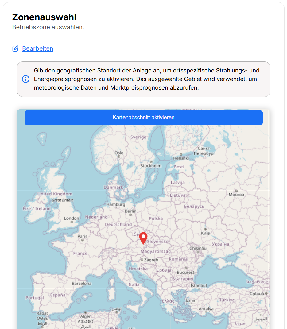 Klicken Sie auf "Bearbeiten" um die Landkarte auszuwählen. Anhand der Eingabe des Anlagenstandortes bezieht das AZZURRO HUB die entsprechenden Marktpreise und Wetterdaten. Klicken Sie auf "Kartenabschnitt aktivieren" um den Standort wahlweise durch Tippen auf die Karte oder Eingabe des Ortes. Die Preiszone wird automatisch übernommen und kann bei Bedarf auch manuell geändert werden.
