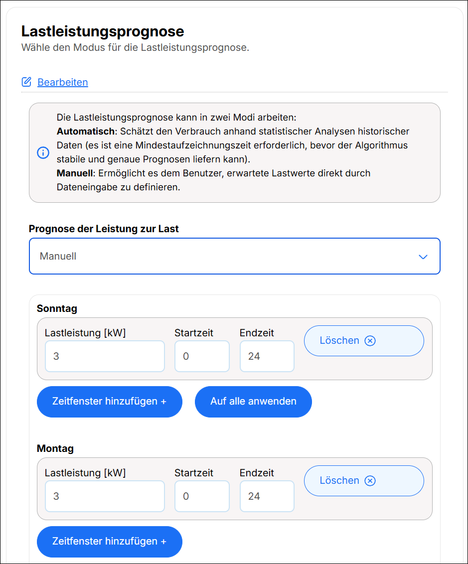 Mit der Auswahl "Automatisch" führt das AZZURRO HUB die Prognoseberechnungen eigenständig durch, was die empfohlene Einstellung ist. Mit der Auswahl "Manuell" können auf Eigenverantwortung eine Vielzahl an Zeitfenstern mit der erwartenden Verbrauchsleistung angelegt werden.