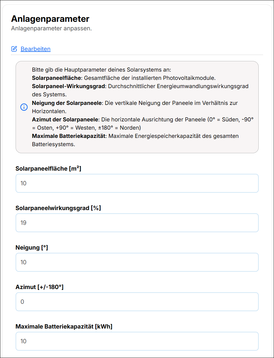 In dieser Rubrik definieren Sie die Fläche Ihrer PV-Installation, den Wirkungsgrad der Module (siehe Hersteller-Datenblatt), Neigungswinkel, Himmelsausrichtung (Azimut) und die installierte Gesamtkapazität der vorhandenen AZZURRO Speicherlösungen.