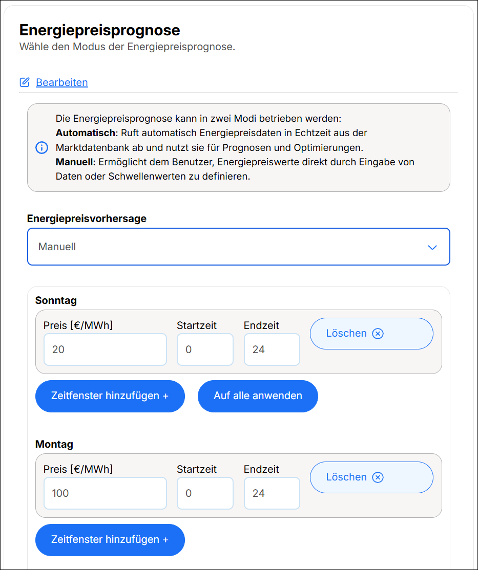 Mit der Auswahl "Automatisch" bezieht das AZZURRO HUB die Marktpreisdaten direkt von der ENTSO-E Transparency Plattform. Diese Einstellung wird grundsätzlich zur Nutzung empfohlen. Die Auswahl "Manuell" erlaubt unter Eigenverantwortung eine Vielzahl an Zeitfenstern mit definierten Strompreisen zu erstellen.