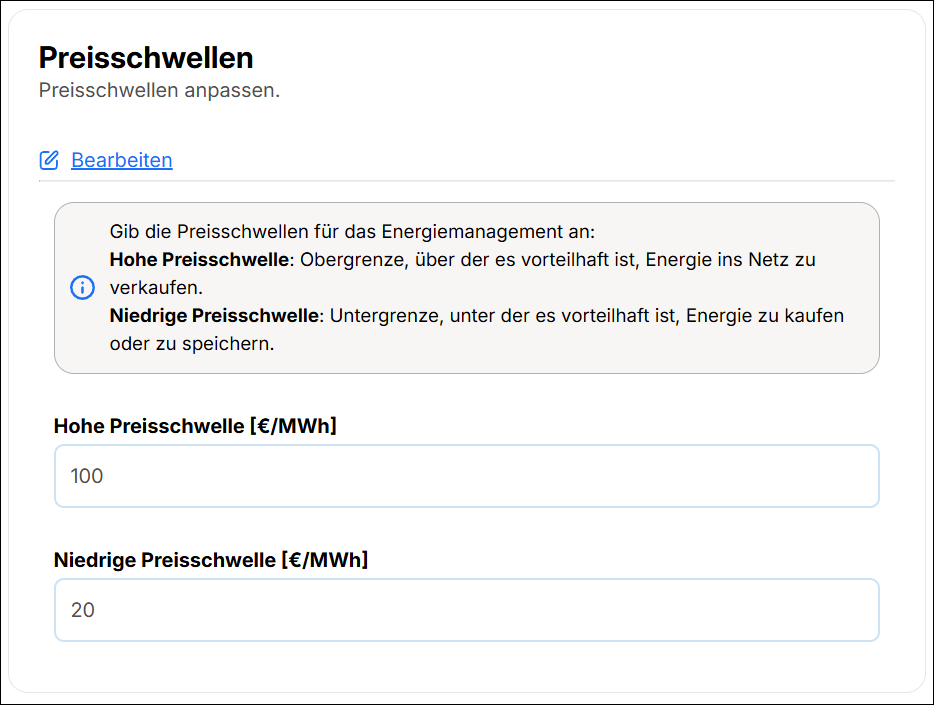 Abschließend können Sie Preisschwellen definieren, ab welchen Sie die Einspeisung oder Bezug von Energie erst gestatten.