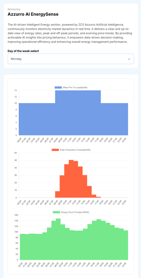 Navigieren Sie zu Überwachung > Azzurro KI Energy Sense. Auf dieser Seite werden die Statistiken zu Lastverbrauch, PV-Erzeugung und Energiemarktpreise transparent dargestellt. Diese werden individuell für jeden ausgewählten Wochentag dargestellt. Im Dashboard können Sie außerdem die Energiedaten der Anlage im Detail betrachten.